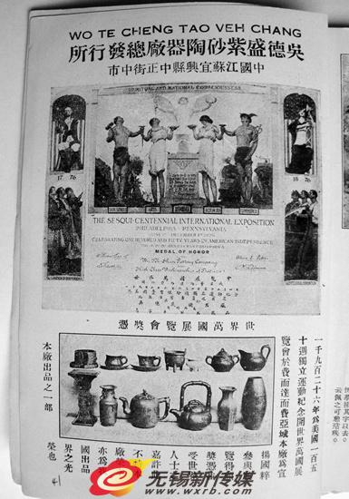 According to Mr. Yang Shiming, the author of Historical Events of Purple Sand in the Republic of China, hu Rongmiao, a veteran traditional Chinese medicine doctor of Beitang Hospital, found in the "old paper heap" in Yang Envy Wonders published in April of the republic of China (1935), there is a precious historical record of Yixing Purple sand winning awards in the World Expo. In the book, there is an advertisement of Yixing Wu Desheng Purple sand Pottery Factory. Explain this factory is located in "yixing county zhongzheng street Zhongshi", and attached a "world exhibition award" photo. The English handwriting on the photo should be the gold medal of Philadelphia Fair in 1926, and the winning variety is "advanced handicraft" sent by Wu Desheng factory.